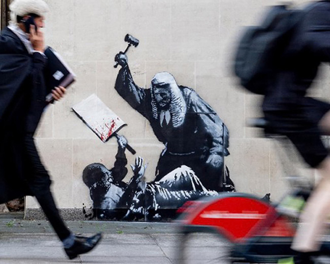 Looks like Banksy has been busy overnight on the walls of the Royal courts of Justice. An incredibly iconic image from whoever took the snap.