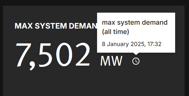 All island - Peak demand reached 7502 MW on 8 January 2025, at the time there was no solar generation and wind generation was insignificant across multiple countries at once due to the weather system parked over us and the neighbours.
