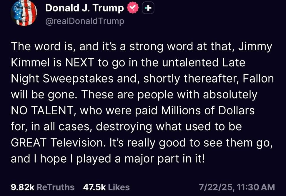 That's why the shoe isn't on the other foot with Kimmel's firing. If it was just ABC firing him for comments, that would be the case, and people would just have to suck it up. As it is, ABC seem to have said they have no problem with what Kimmel said, but have fired him because of what Trump will do them if they don't. That's the dangerous point.