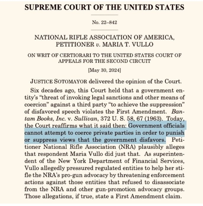A reminder that last year, the Supreme Court made a definitive ruling (NRA vs Maria T Vullo) that government officials cannot attempt to coerce private parties in order to punish or suppress views that the government disfavors.