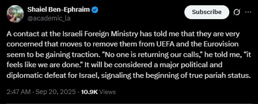 Israel’s Channel 12 reported that UEFA’s executive committee is expected to meet, and Israel’s national team might be removed from European qualifiers, with clubs like Maccabi Tel Aviv banned from the Europa League.