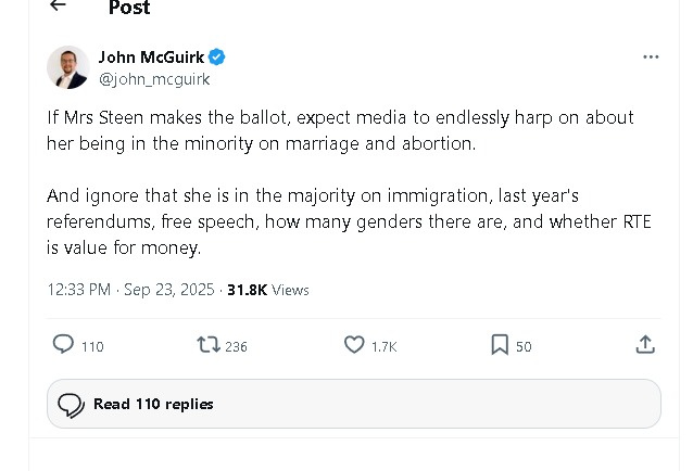 I don't have much of an issue with Aontu despite agreeing with them on SFA and would never call them far right, but its going to be Malachy Stenson, Gavin Pepper types doing just as much work on the ground as Peader sadly. She may in private curse them , but would she distance herself from them? Unlikely.