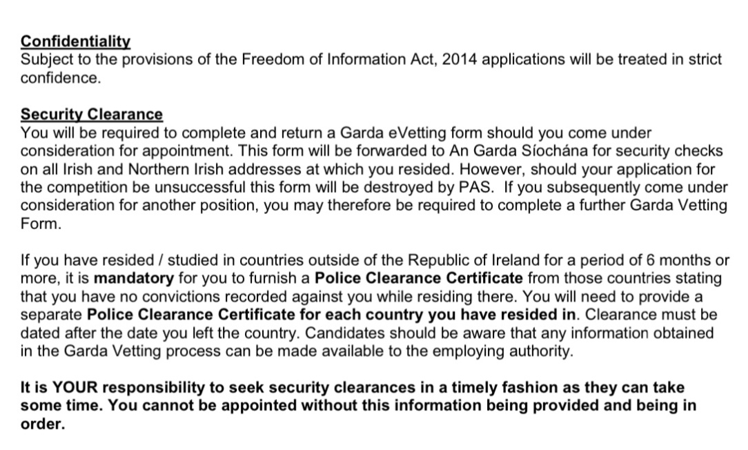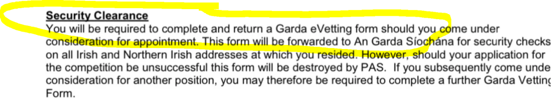 You will see that common security procedure for working in LH does NOT only include jobs involving children and youths. Those who were Successful in the application were not eligible to take the post unless Garda Vetting already cleared. Also must abide by official secrets act etc.