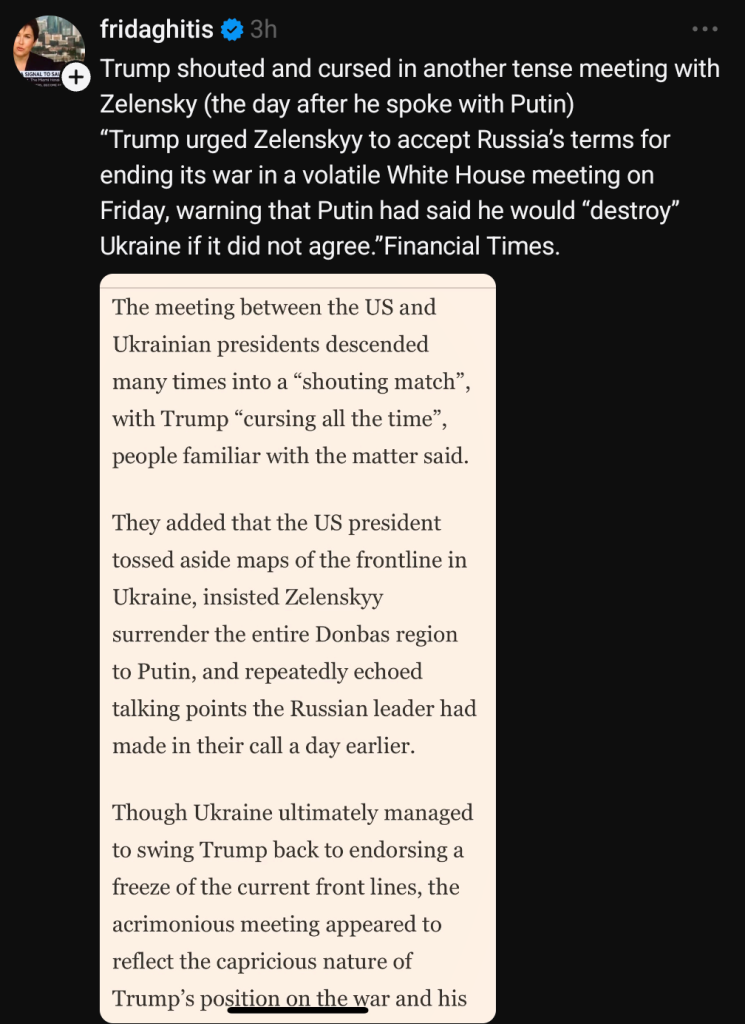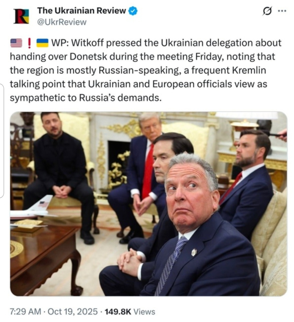 He also describes the occupied Ukrainian land as "property". What about the people living there, who are being denied social services unless they take out Russian citizenship, and losing their homes to settlers from Russia? This should not be normalised in the name of a bad "peace". It really is Appeasement.
