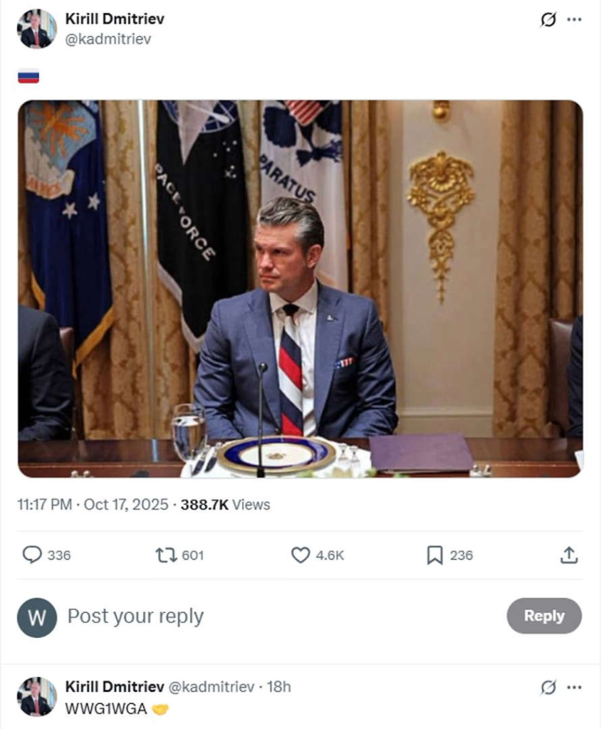 Kirill Dmitriev, head of the Russian Sovereign Wealth fund, tweets a QANON reference and a picture of Pete Hegseth, hinting he was paying homage to Russia with the tie that resembles the Russian flag.