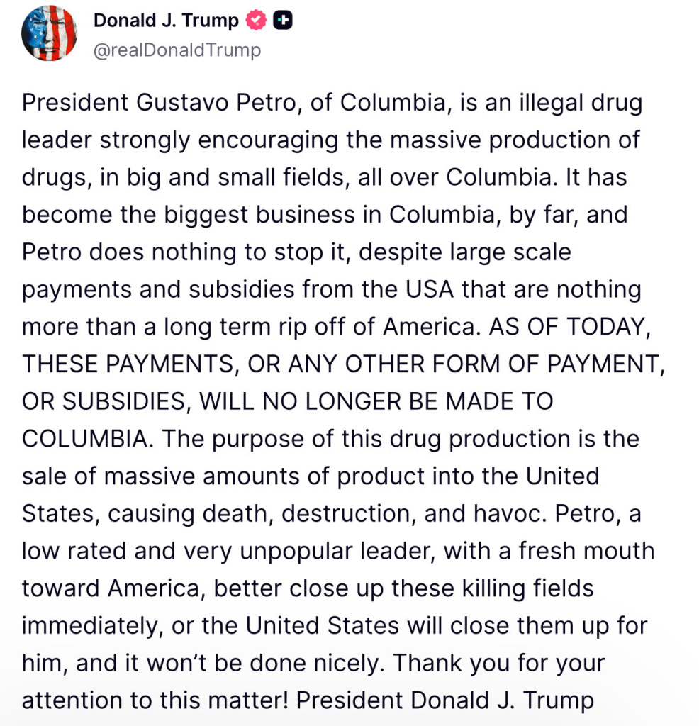 On 19 October 2025, Trump posted on his social-media platform that President Petro was “an illegal drug leader” who “strongly encouraging the massive production of drugs, in big and small fields, all over [Colombia] … despite large scale payments and subsidies from the USA.”