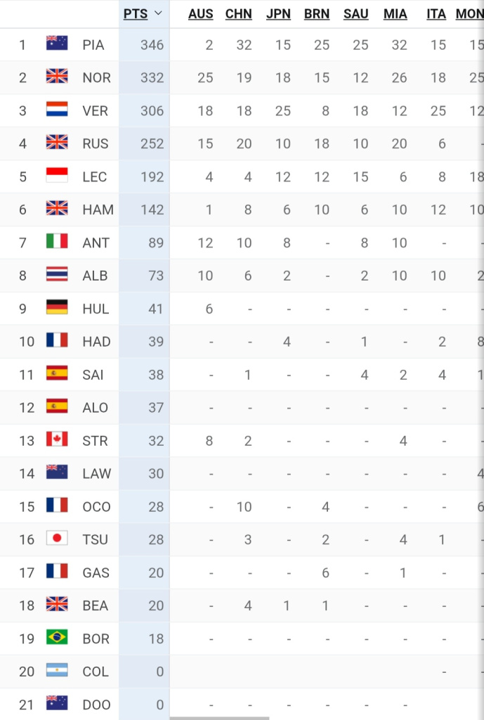 Yep. Also looks like Merc and Ferrari are able to take points off McLaren too which makes things more interesting. Oscar has to be feeling a bit edgy seeing that monster points lead he had evaporate.