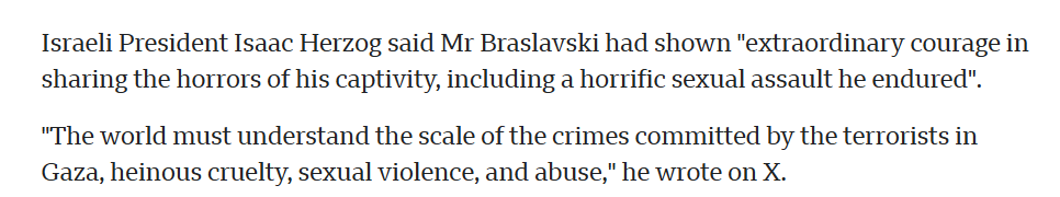 One of the Israeli captives returned to Israel in the final batch a few weeks ago has alleged that he was sexually assaulted whilst in captivity in Gaza (becoming the first to do so publicly). The Israeli President said the following as a result: