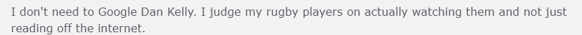 First you angrily respond to someone suggesting that Dan Kelly isn't being hyped on just 'one full game', that he has a reputation from his professional career before he moved to Munster that many rugby fans knew about, by saying