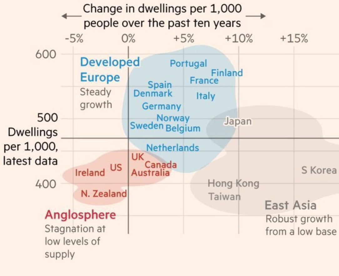 But if we built double the current rate of crude numbers of homes, our output per capita would be about 12 per 1,000 citizens. In 2023 the country ranked just below us was 5.88 (we were 6.12) per the Deloitte Housing Development intensity review of 19 European countries. Is that realistic? I would say again that we are too beholden to the idea of perfect planning. The dream of having all the infrastructure there for new builds is delusional. That’s part of the problem, we’ve swung the other way. This is constraining supply to a degree but you are overegging the comparison with prior decades.