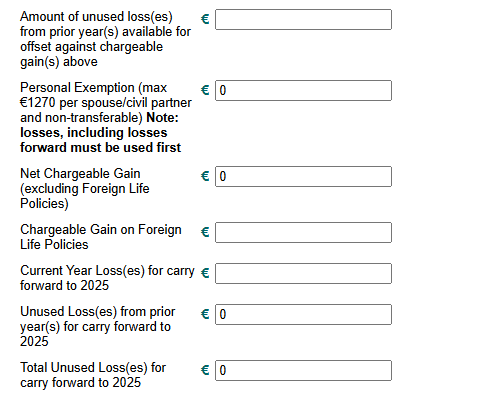 CGT Section. Enter proceeds and cost. And it sounds like the annual personal exemption of €1,270 will cover the gain. At last section of return, enter table gain nil, tax due nil etc