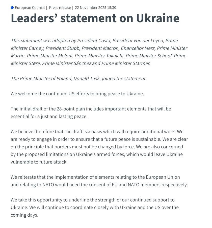 European leaders statement on Russias 28 point peace plan for the Ukraine conflict.