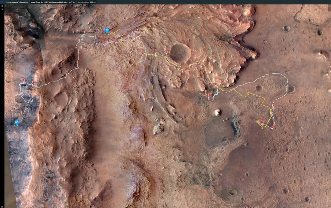 Route of the NASA Perseverance Mars rover from its landing site in the floor of Jezero Crater to beyond its rim over 1690 sols and a total distance of 39 kilometres travelled.