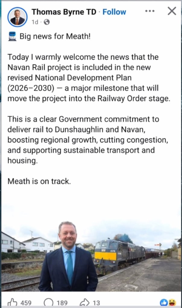 Also significant numbers of new homes could be built if the train line was open, in Navan and along the route. This should resolve any concerns about the CBA.