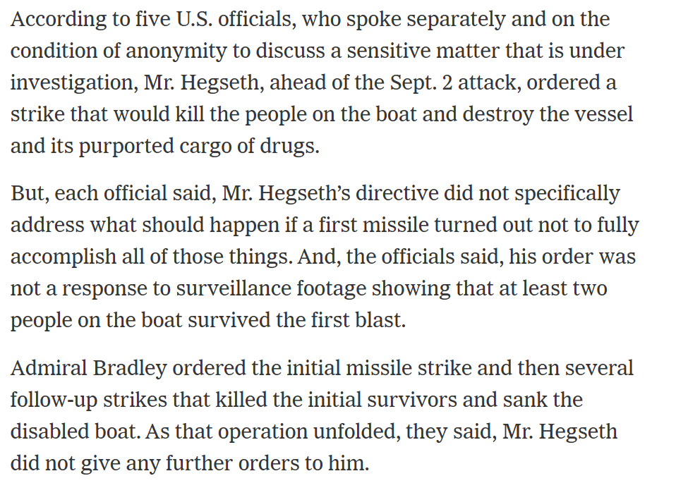 2. Even if Hegseth did mean "no quarter", that doesn't mean that Bradley followed such an order and ordered the second strike to kill survivors. He has an obligation to ignore a 'no quarter' order, he does not have an obligation to ignore a 'sink the boat' order, even if that order results in the deaths of all.