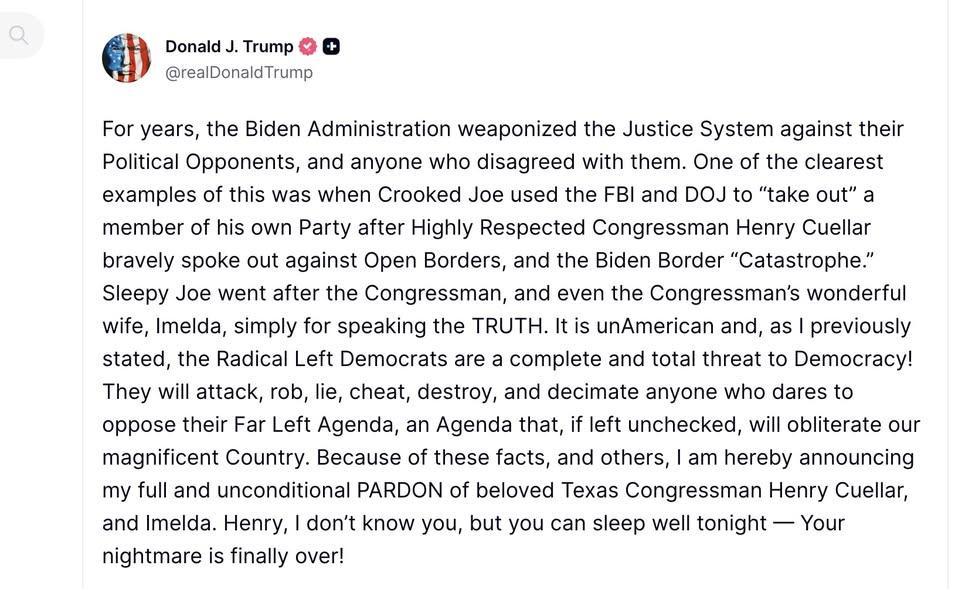 Edit - hang on, this is Trump doing Pardon by tweet, has Cuellar even been asked if he wants to be pardoned, given that this would be an admission of guilt? How does that work?