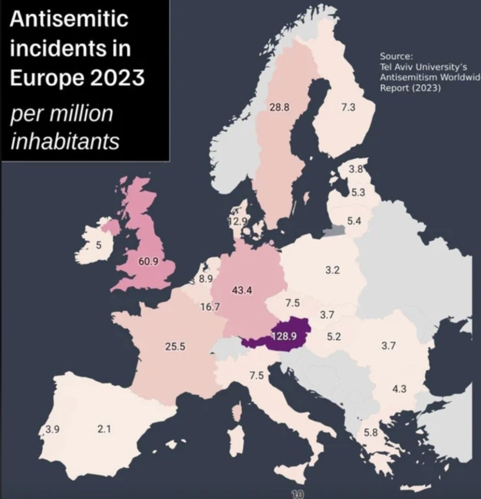 It's also a map on anti-Semitism from a Tel-Aviv body, which I'd always be wary about, given how often Israeli officials have accused Ireland of anti-Semitism in the past two years for stuff that is actually anti-genocide. (I'm presuming protests against Israeli actions in Palestine aren't counted as an anti-Semitic incident)