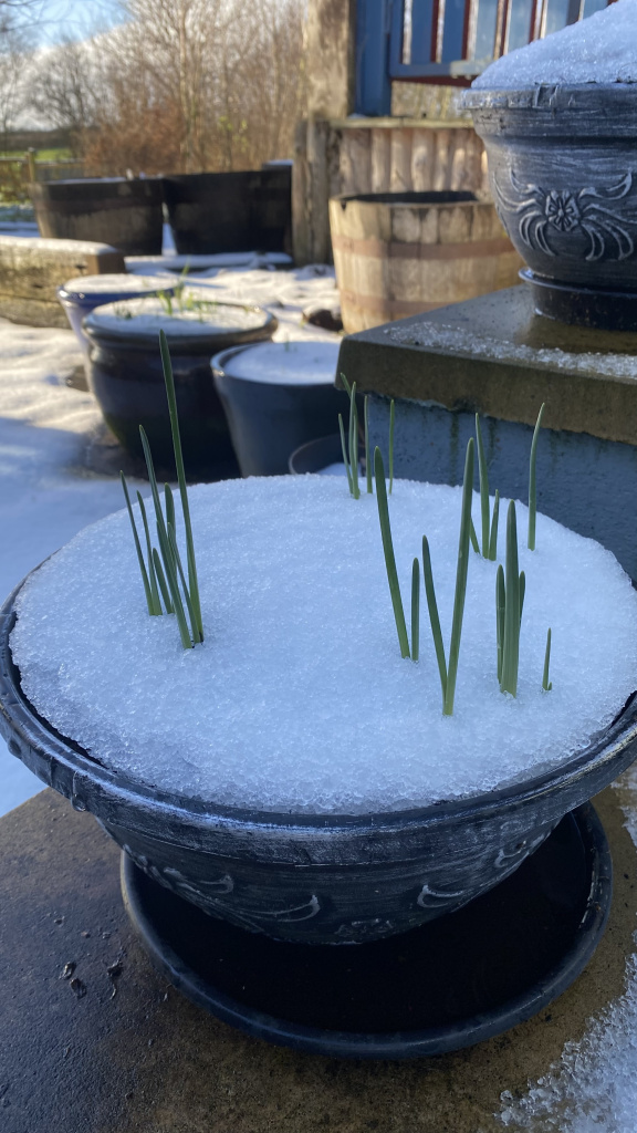 Some potted bulb shoots peeking through the snow. The snow drops too are beginning to come up in the garden. A lovely sight.