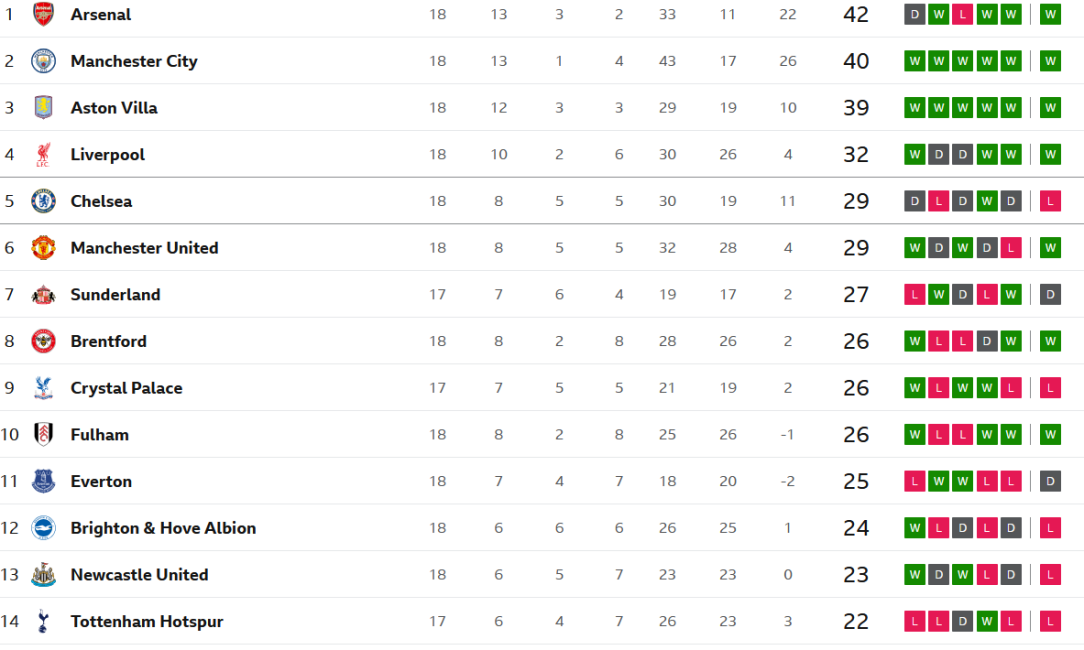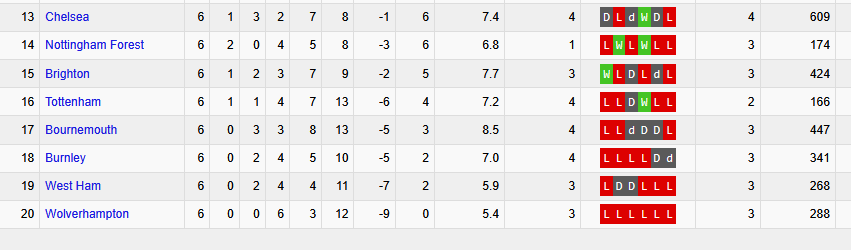 Chelsea and Spurs have hit some awful form. Good for us, considering Villa look like taking a top 5 spot. Would not have expected Brentford to be many places above Spurs considering the players and manager they lost