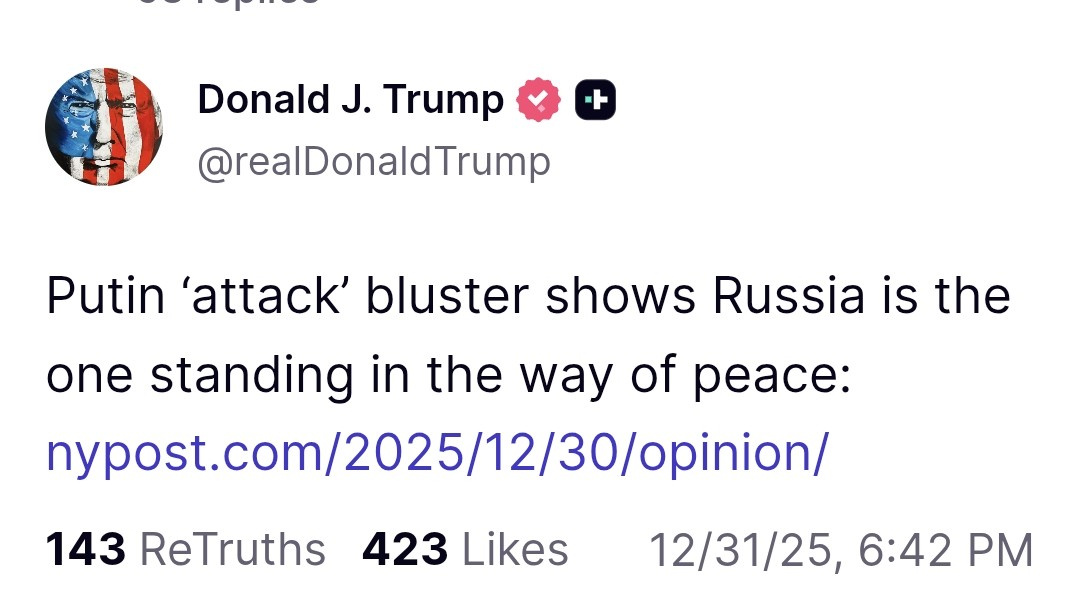 Post from Trump on Truth Social - sounds like he doesn't believe Putin re the drone attack