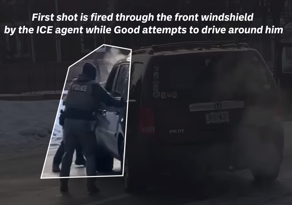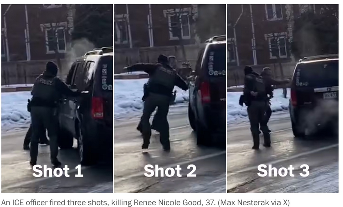 it is quite obvious that they are not actually performing immigration enforcement. She was actually not obstructing them. She had already waved the ice vehicles on one of which can be seen passing her. The next vehicle chose to stop and attack her. She was a us citizen and they had no power to do what they did. They were masked thugs out on the street dressed up in some form of militia uniform. In one of those clips I saw a police badge on his chest. This was a crime in itself of impersonating a police officer. They are not a police officers. What they did was completely illegal. It also contravened the regulations set out for all law enforcement agencies in how to deal with vehicles. How can a stopped vehicle be threatening your life and the life of others. When the vehicle first moved it reversed away from him. The driver turned the wheel away from Ross and moved forward at 2or3 miles per hour. No reasonable person could fear for their life. Confirming this is the fact that he was still filming the vehicle on his phone When the car moved. He drew his weapon as the vehicle was still stationary. You can dress it up any way you like but he still murdered her in cold blood.