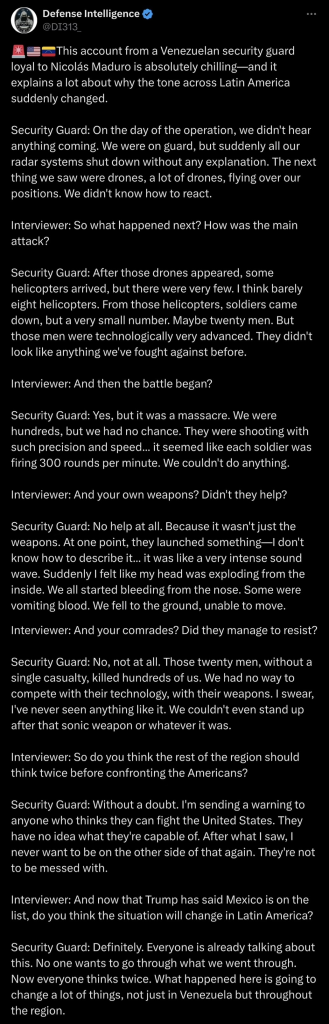 Suggestions that something producing similar symptoms against Venezuelan soldiers were used by the US to disable the radars. Produced health affects like vomiting and nose-bleeding. Karoline Leavitt retweeted it.