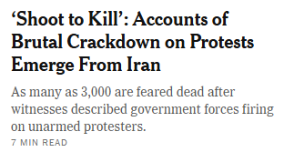 New York times saying as many as 3000 feared dead in Iran. I thought Trump said if any harm came to protesters that the US would be locked and loaded to retaliate?