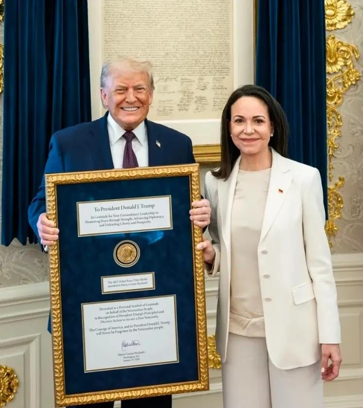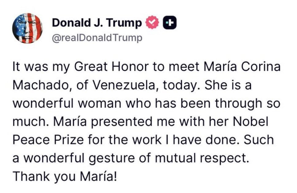What a saddo giving that insufferable dotard the Nobel peace prize. She was pro the slaughter in Gaza so not sure how she got it to be begin with. It’s farcical at this stage, like when they gave it to Obama just because he was the first non fully white US president as US bombs ran down on villages. Joke through and through.