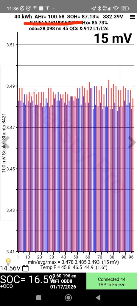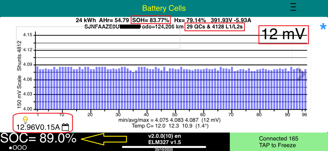 The large number (12mV) is the cell imbalance. A low number is what you want. Below 30mV is excellent. Below 50mV is good. Anything higher means the cells are not balanced, or you have bad cells, usually the former. But you won't know for sure until the car has completed a full charge cycle on a slow charge. I always ask the seller to charge the car to 100% and leave it plugged in for a couple of hours after it is charged (until the charge lights go out).