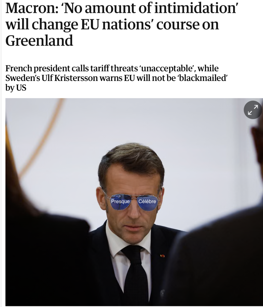 I'd approach the U.S commerce giants about Trump's use of the tariffs card again and remind them the last times he used it was supposedly for the purposes of getting trade deals advantageous to the U.S commerce industry but this time tariffs are nakedly being used to satisfy some imagined whim of Trump's that Greenland has to be seized [in the style of Putin] and possessed by the U.S [Trump] for military strategic purposes.