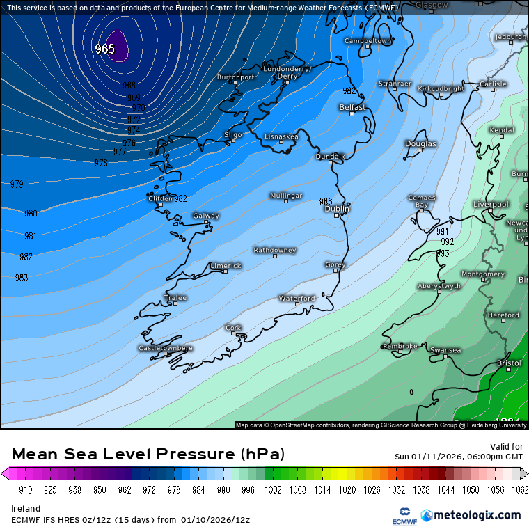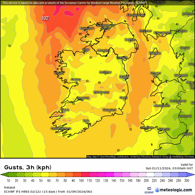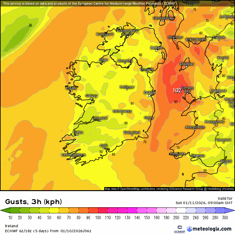 ECM showing a windier day over much of Ireland than the other models. Very windy in the SW, S on the last two runs, close to Orange warning level. Very windy overland much of Ireland gusting 80 to 90Km/h or even up to 100km/h on the latest run, . One to watch.