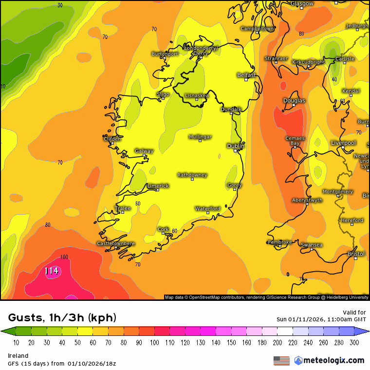 GFS has been getting progressively windier the last two runs and the strong winds coming into the SW earlier than the Yellow warnings, surprised Met Eireann haven't changed them . GFS now a lot windier in the W and NW with high end yellow there, not far off Orange warning level, if it upgrades again it could be in the W /NW. All areas getting some strong winds gusting up to 70 or 80 km/h for a time .