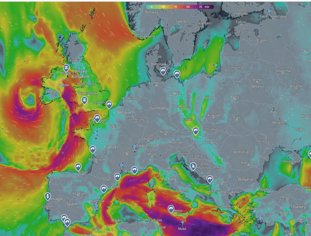 You're correct that most of our weather systems move in a North Easterly direction. They move at an average speed of 15-25 kph reaching the UK 24 hours later. We can export our surplus when it hits Ireland and they can export their surplus back to us the following day.
