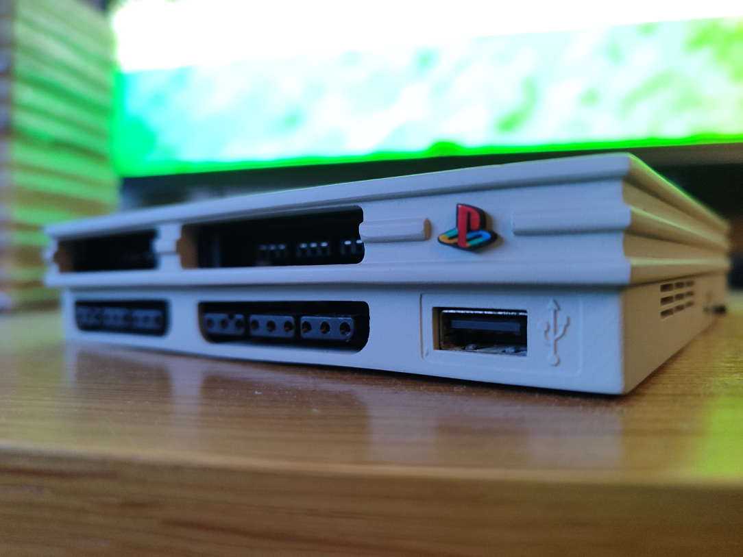 ^^ SD Card in the side for the internal MX4SIO mod, nice neat switch to enable/disable it, the 3D Printed power button forms the O of the Playstation Icons, there's a fresh air intake grille now there too.