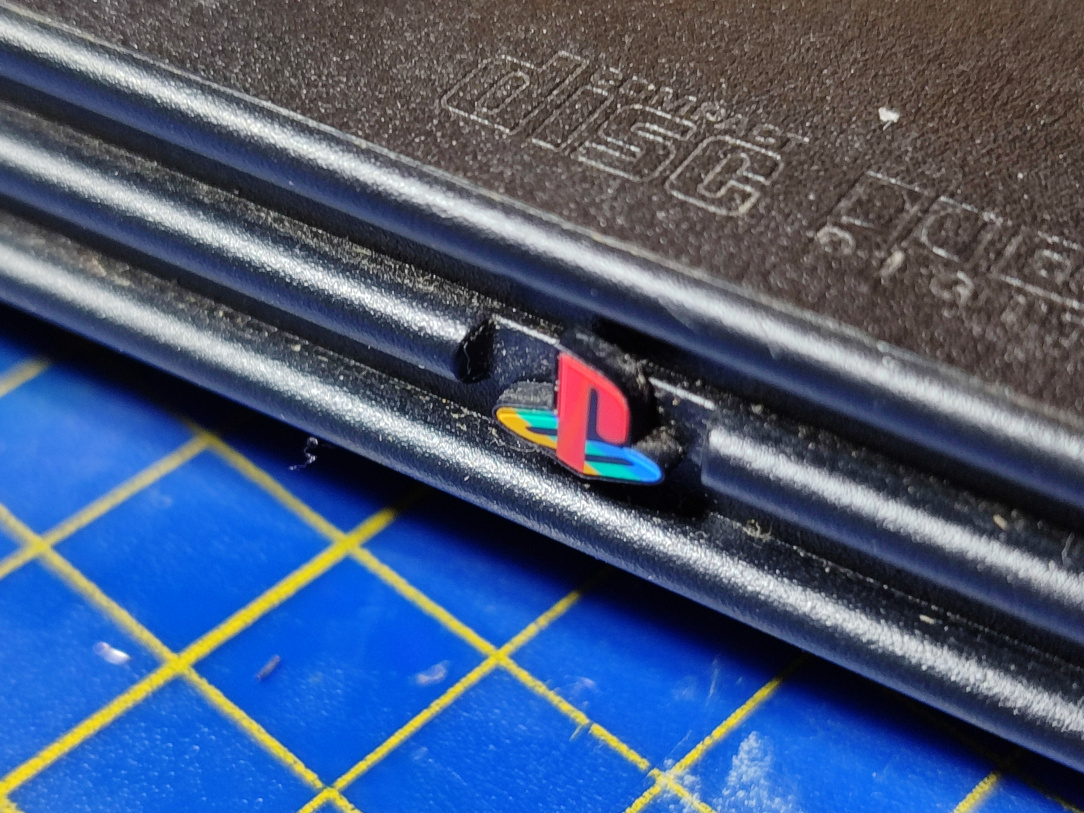 ^^ Now that the PS2 is MUCH smaller, we'll no longer be using the original shell. For the new shell, we'll salvage the PS2 logo from the old one.