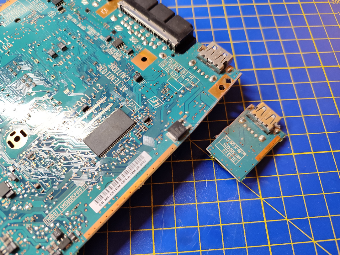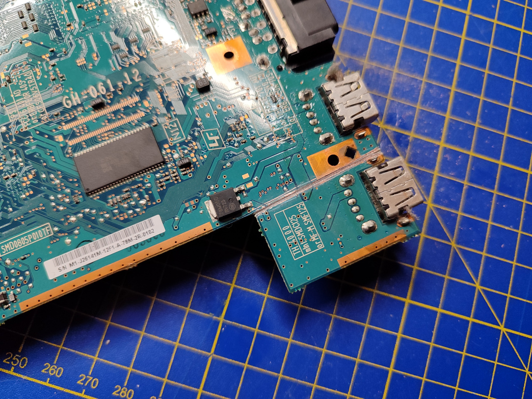 ^^ We cut right through, sacrificing one of the USB ports in order to reduce the size of the mainboard even further.