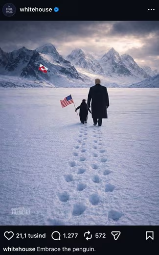 an AI-generated image was posted on the White House's official Instagram profile  of what appears to be Donald Trump, seen from behind, walking side by side with a penguin in a snowy landscape against the Greenlandic flag. It is not known whether the White House is aware that there are no penguins in Greenland.