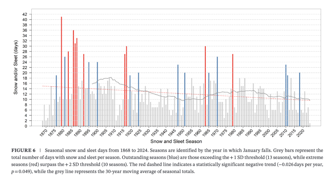 On a more long-term scale, there was a paper last year "A Monthly Snow and Sleet Series for the Greater Dublin Area 1867–2024" which showed further evidence of the decrease. Look how "snowy" the late 19th century was with many big seasons - most notably the winter of 1878-79. Note the season goes from October to May and the year is of January. The last extreme snow season (2 standard deviations above normal) in the Dublin area was 1978-79. The biggest seasons since were 2009-10, 2010-11 and 2017-18. This does not take account for how much snow fell or depths which is a very different matter. 2023-24 was the first winter in the series to have had snow/sleet falling for one single day (I'm sure we remember it well, March 1st). Interestingly, the running average is not yet at the low point that it was through the 1940s when the North Atlantic was also in a notably warm state showing there is some degree of correlation likely with the Atlantic sea surface temperatures and the frequency of snowfall in Ireland. Unless we see a dramatic flip like the 1960s, it is likely that the running average will equal or even be worse than the previous low point.