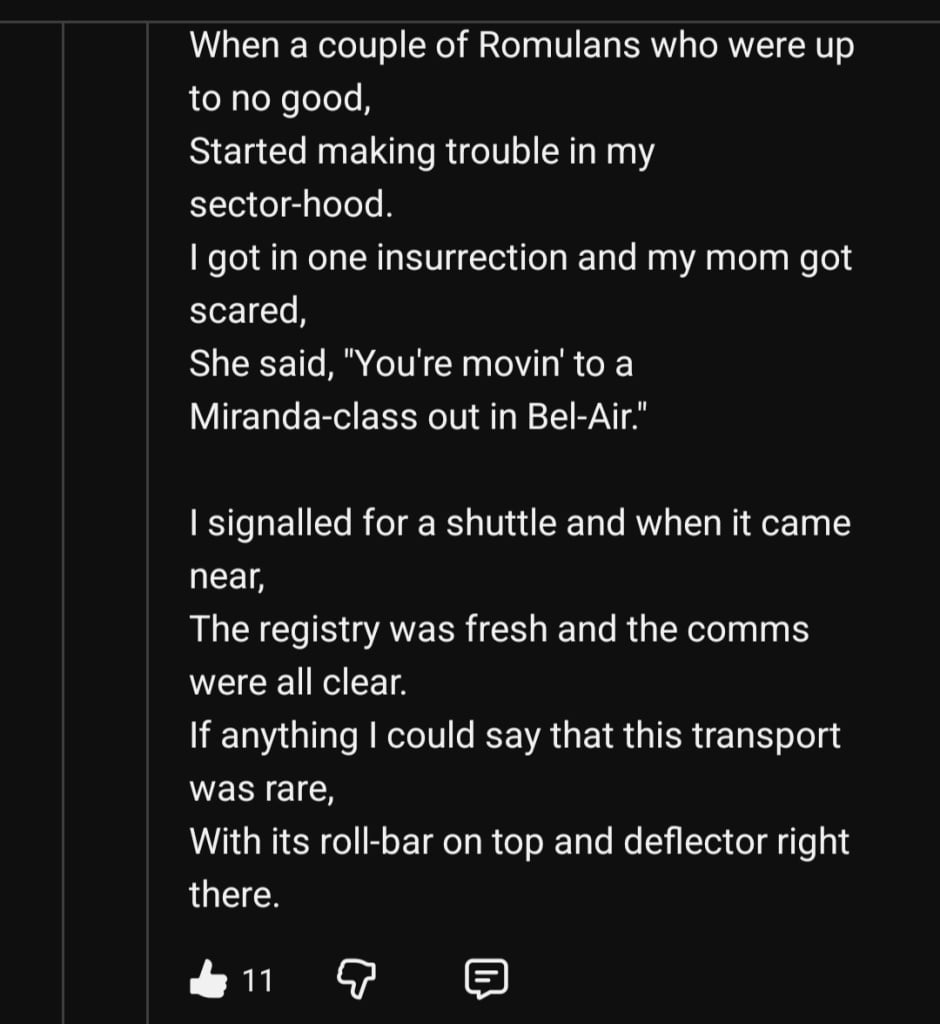 They are not fans of Kurtzman-era Trek, but unlike the hate-watching «anti-woke» YouTubers who usually take that position, these guys focus on the quality of the shows themselves. They give their reasons usually for not liking a thing, compared to just wailing about diversity casting. They even stopped their reviews of Discovery after Season 2. They just didn’t have any interest after that.