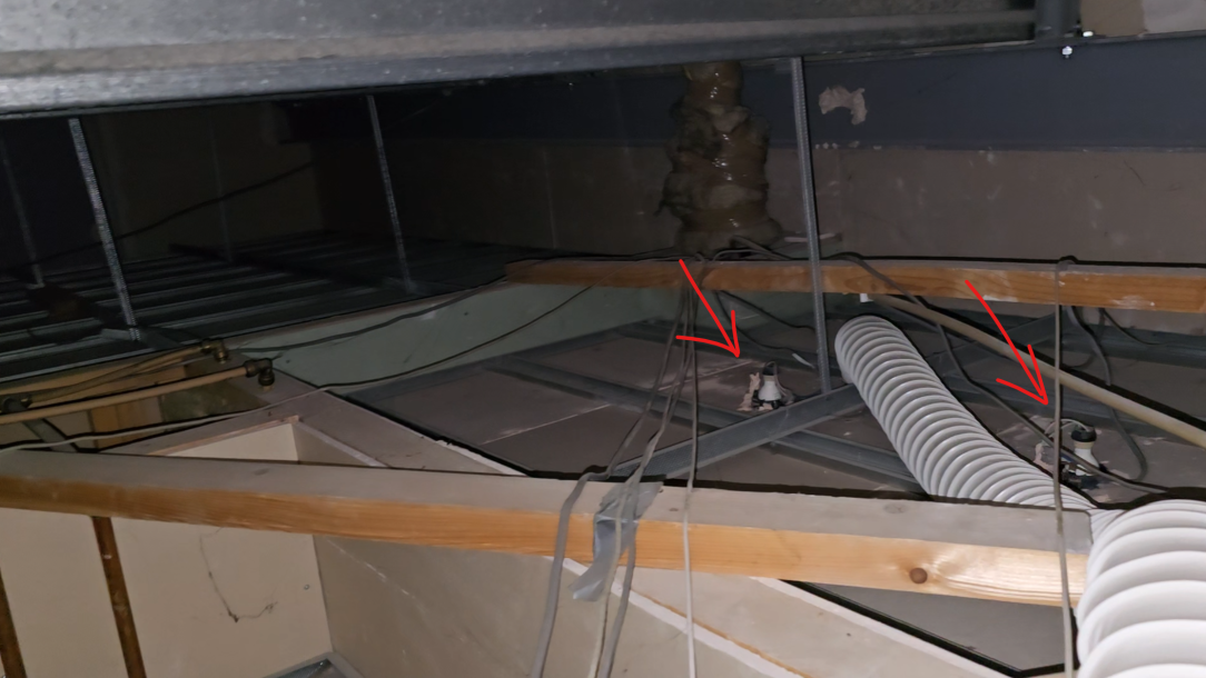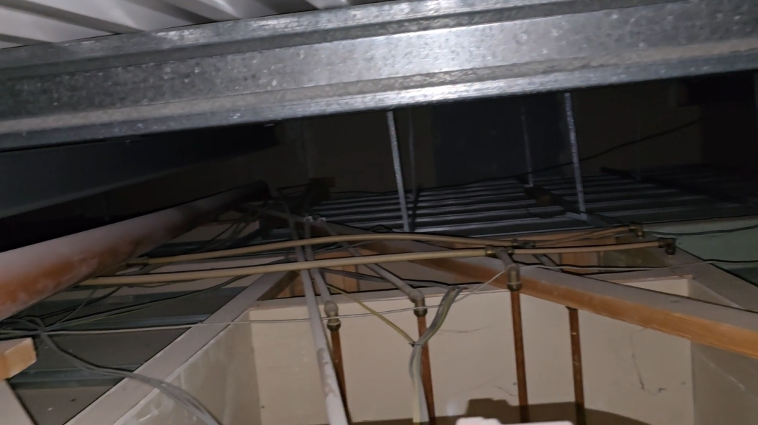 1,are you gaining access to this area through a hatch in your apartment or one in a common area. 2,are all the walls that you can see the tops of in photos, internal divides for your apartment or do some of them belong to other apartments. 3,is the flexible vent hose venting to the outside and is it from bathroom or kitchen.
