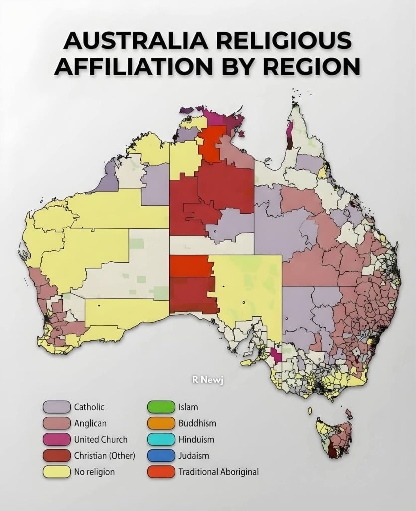 Predominant religious affiliation in Australia by region (county)