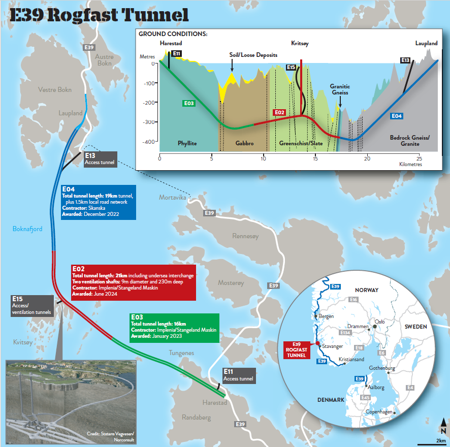 Map and vertical cross-cross-section of the Rogfast tunnel under construction along the West Coast of Norway, connecting Stavanger with Bergen on the E39 route.
