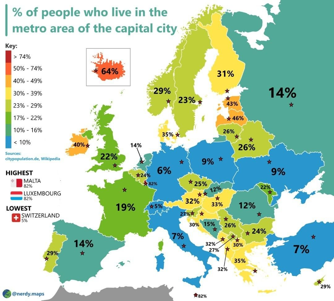 Percent Of People Who Live In The Capital City In Europe