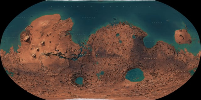 Extent of the ancient Northern Martian ocean that is now believed to have existed circa 3.8 billion years ago, based on the most recent scientific research by planetary geologists using data from various unmanned Mars missions.