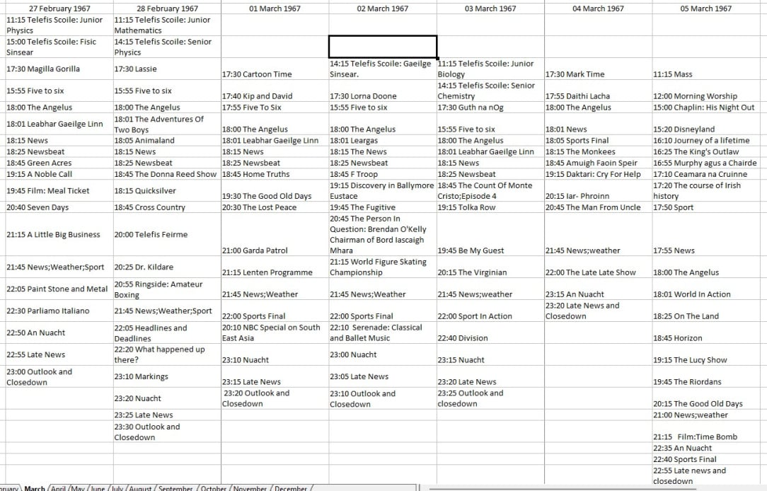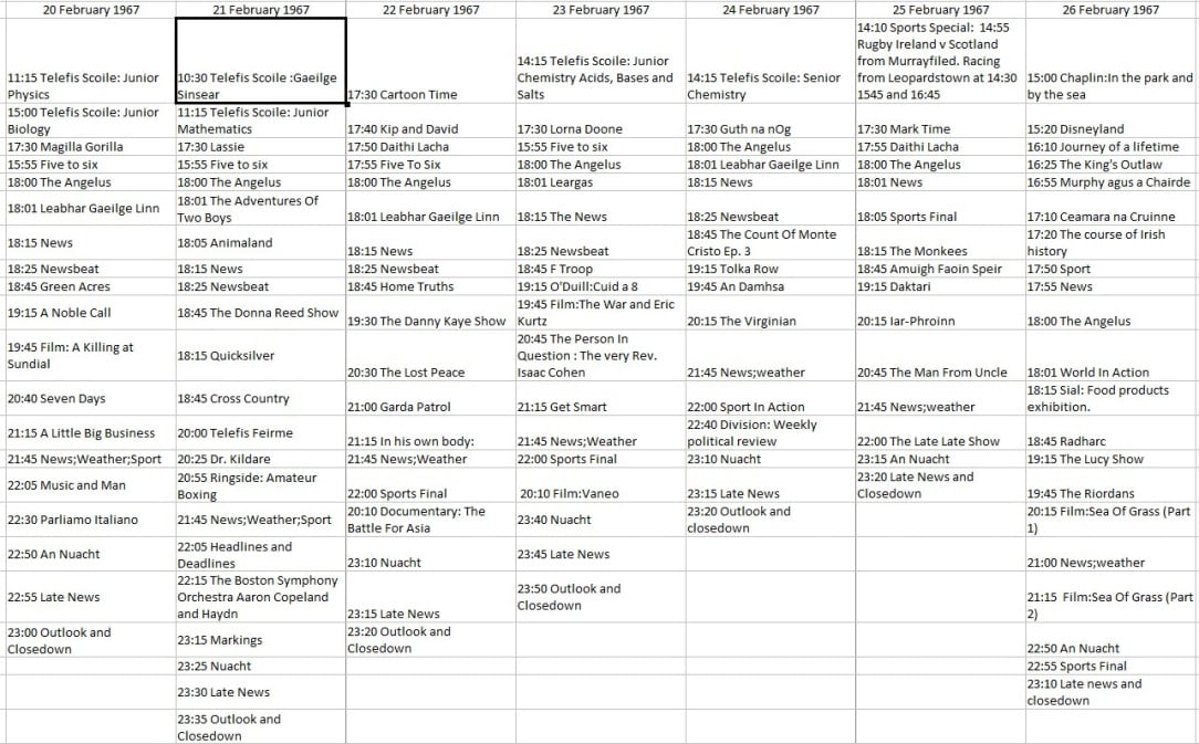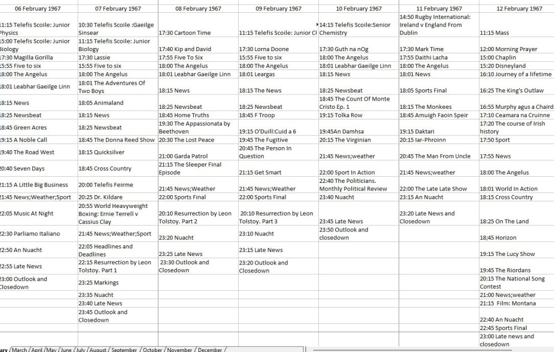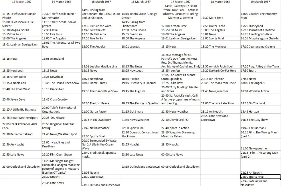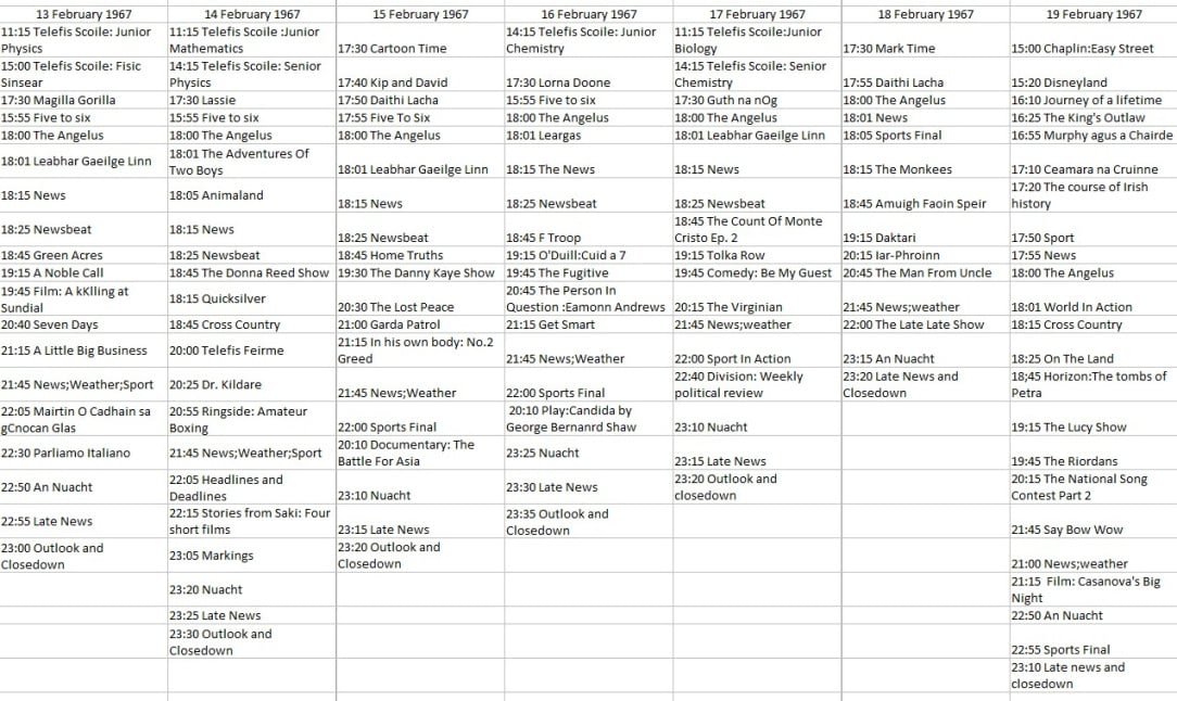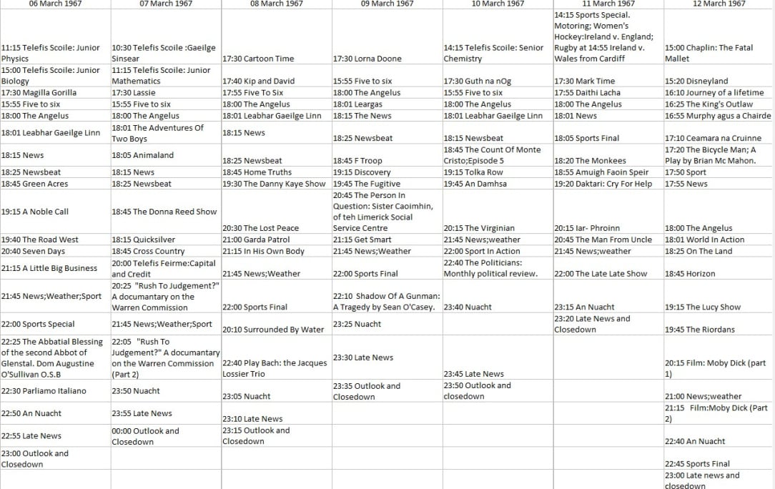 NNote Aside from the BBC Sunday classic versions of Lorna Doone and the Count of Monte Cristo with Alan Badel (RTe regularly bought the BBC Sunday classic), so few British drama and no UK sitcoms. Aside from the Good Old days, it is all docs or educational shows like Parliamo Italiano. Compare with ten years later.