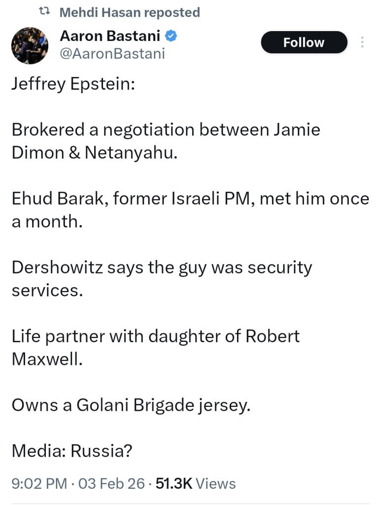 There's no doubt in my mind that there were also many people behind Epstein as well. You don't get to be that powerful without drawing the attention of certain "agencies" and it would come as no surprise whatsoever if he, himself, was compromised at one point by Mossad or the CIA and brought into the fold, as it were, to act on their behalf.