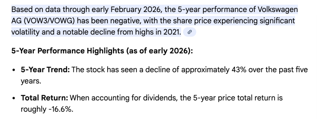 Share price of VAG over 5 years has fallen approx 45% and when adjusted for the dividends this is a fall of 16.6%. In contrast Tesla has grown over 5 years by 42.9%. A gain of 42.9% against a loss of 16.6% represents a like for like comparison (adjusting for div policy). This is factual historical and who knows that the future holds for either..but banging on about dividend alone is naive and does not stand up to scrutiny.