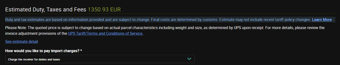 On a watch that I sold for €3k, the Import Tariff due on the buyer is €1350.93.