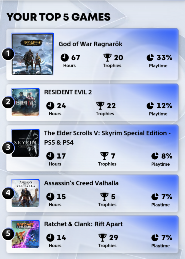 God of War Ragnarok was a real grind at times but still very enjoyable. RE2 is the best game I've played in a long time. Skyrim, because Skyrim. AC Valhalla was getting to and trying the Ireland Expansion. Beautiful looking game, but bland. Rachet&Clank spectacular graphically, but pretty average game.