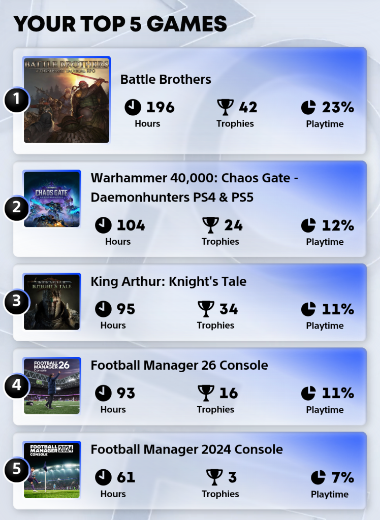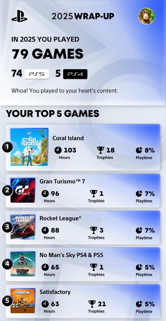 I had covid for a couple of weeks and Coral Island was about the only game I could manage. Also happy to see Rocket League on the way out, haven't played it in months and no intention of going back to it (still no PS5 version). Satisfactory creeping in, would be higher but im taking a break from the straight 60 hours i put into it.